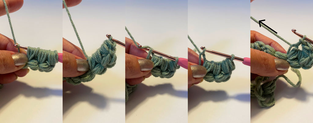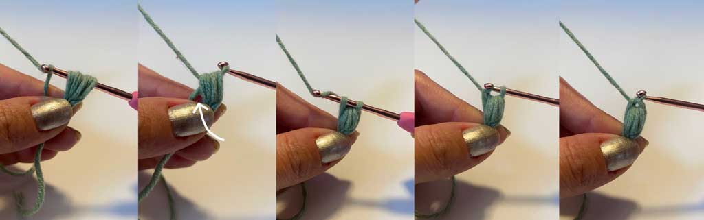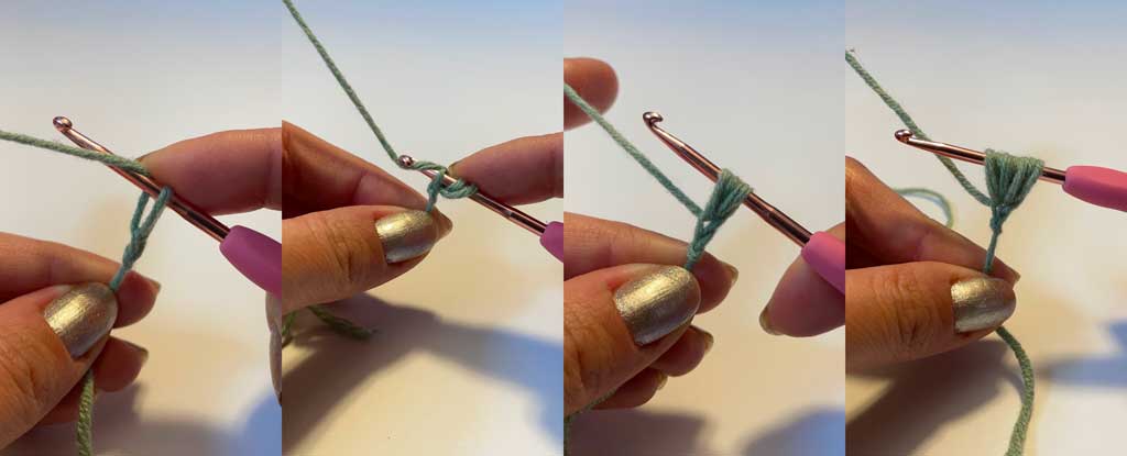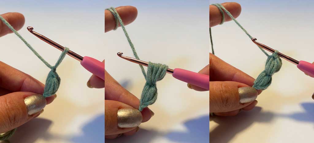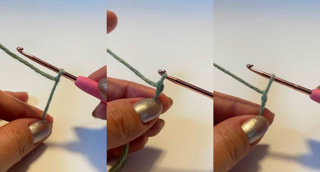 02: Napravite navijutak, ubacite heklicu u početnu petlju, zahvatite predivo i provucite ga kroz petlju. Ponovite ovo 2 puta (možete i više, u zavisnosti od debljine prediva). Obratite pažnju na to da vam je navijutak i provučeno predivo iste visine kao prva petlja na heklici.