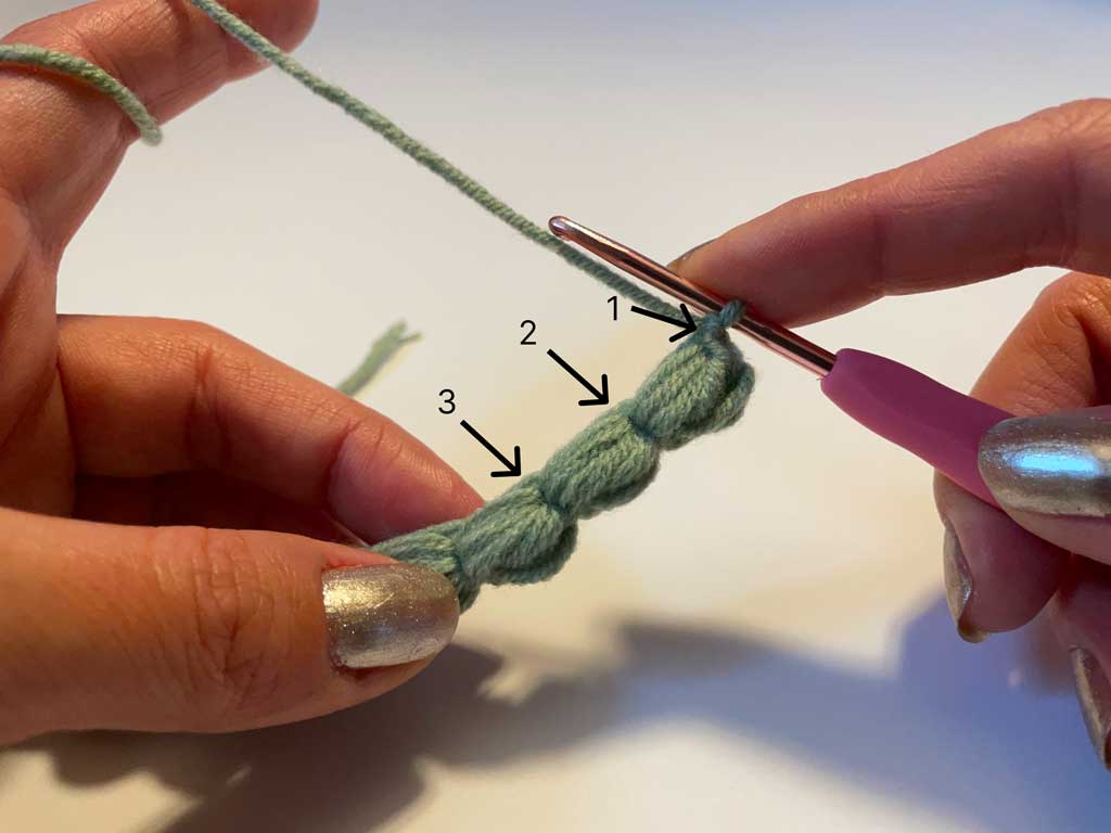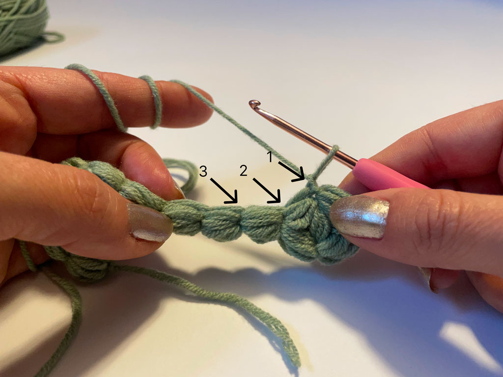 06: Uradite korak 02 u mesto 1 – napravite navijutak, provucite heklicu kroz vrh latice, izvucite predivo i ovo ponovite još 2 puta. Zatim, dok vam je svih 7 petlji još uvek na heklici, uradite isto u mesto 2 sa slike, a zatim i u mesto 3. Na heklici ćete imati 19 petlji (7 petlji od prve latice, 6 od druge i 6 od treće).