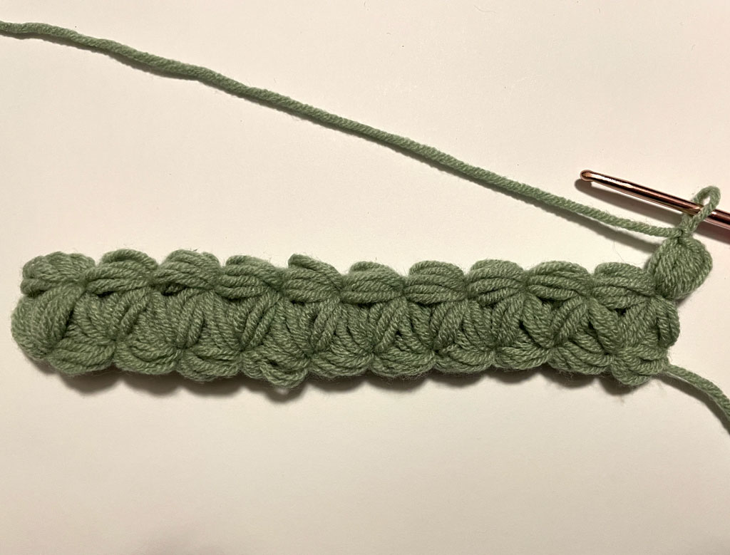 Za ovaj primer sam napravila 10 latica, ali vi možete koliko želite da biste dostigli željenu dužinu uzorka. Ukoliko vam se ovaj prvi red uvija, ne brinite, sve će se ispraviti usput. Sada kada smo završili prvi red, počinjemo sledeći red.