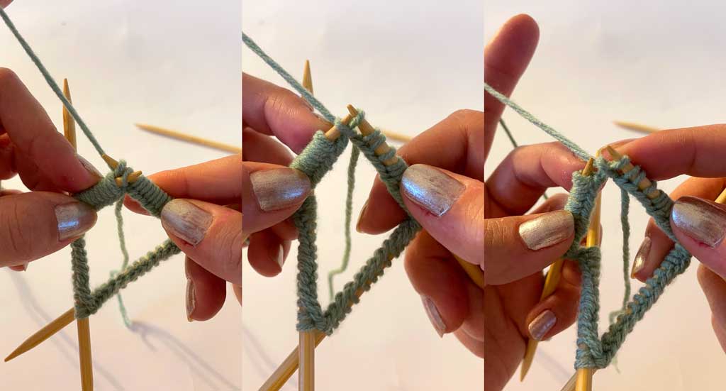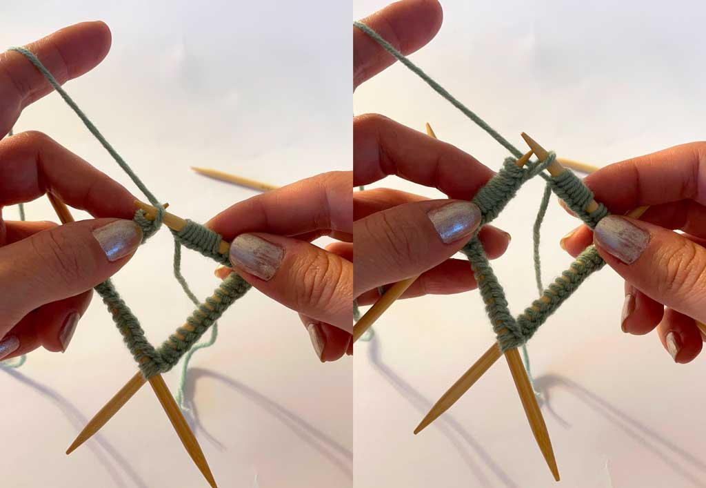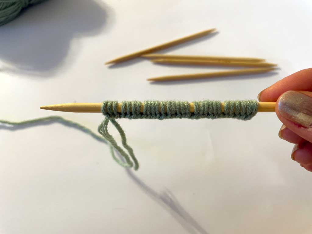 03: Na kraju, vratite preostalu petlju nazad na prvu iglu i lagano zategnite slobodni kraj konca.