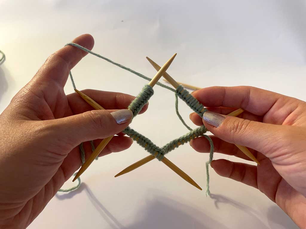Kada ispletete sve petlje sa prve igle, pomerite ih ka sredini da ne skliznu, a zatim pređite na sledeću iglu i nastavite pletenje u krug. Tako se redovi neprekidno nastavljaju, formirajući glatku, bešavni cilindar.