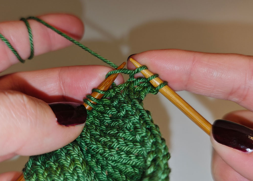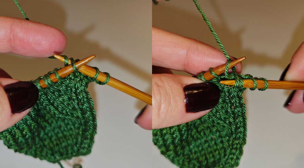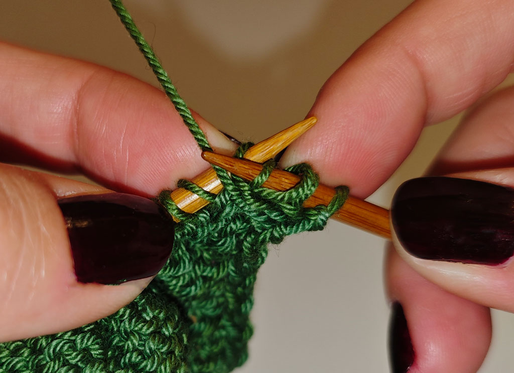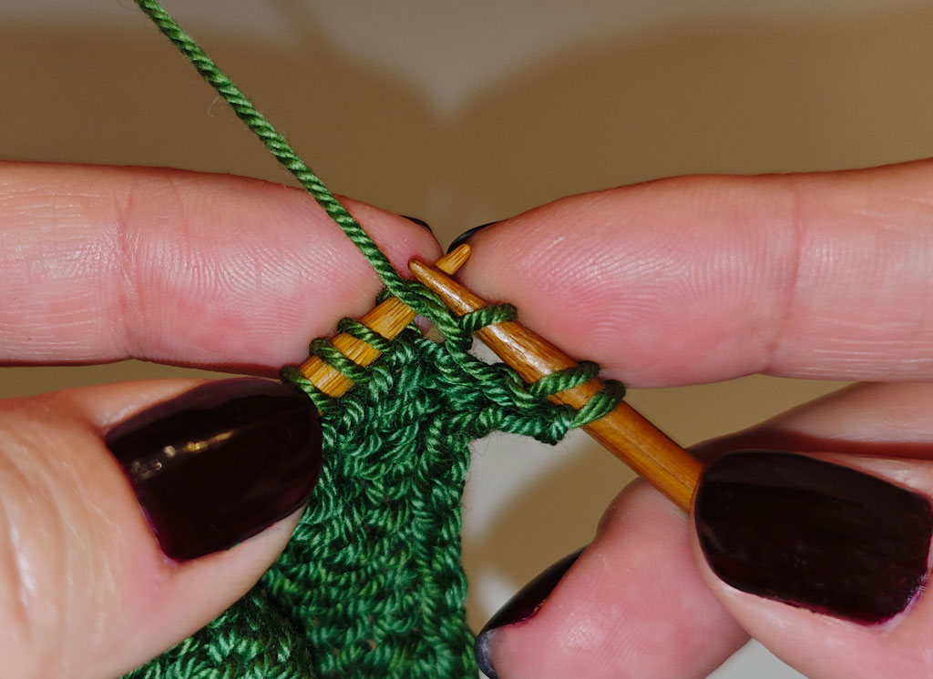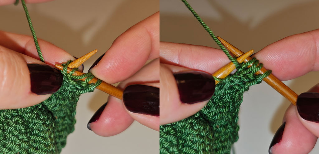 01: Ispletite jednu petlju pravo, ali ne skidajte petlju sa leve igle.
