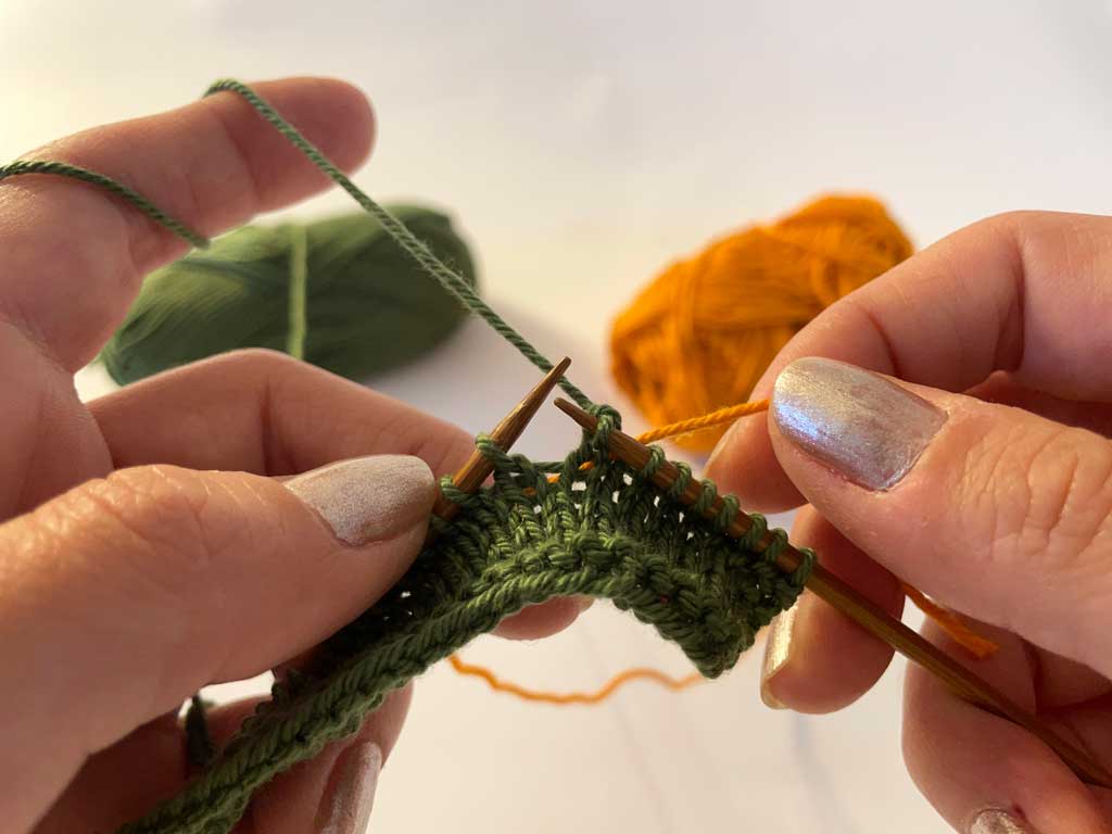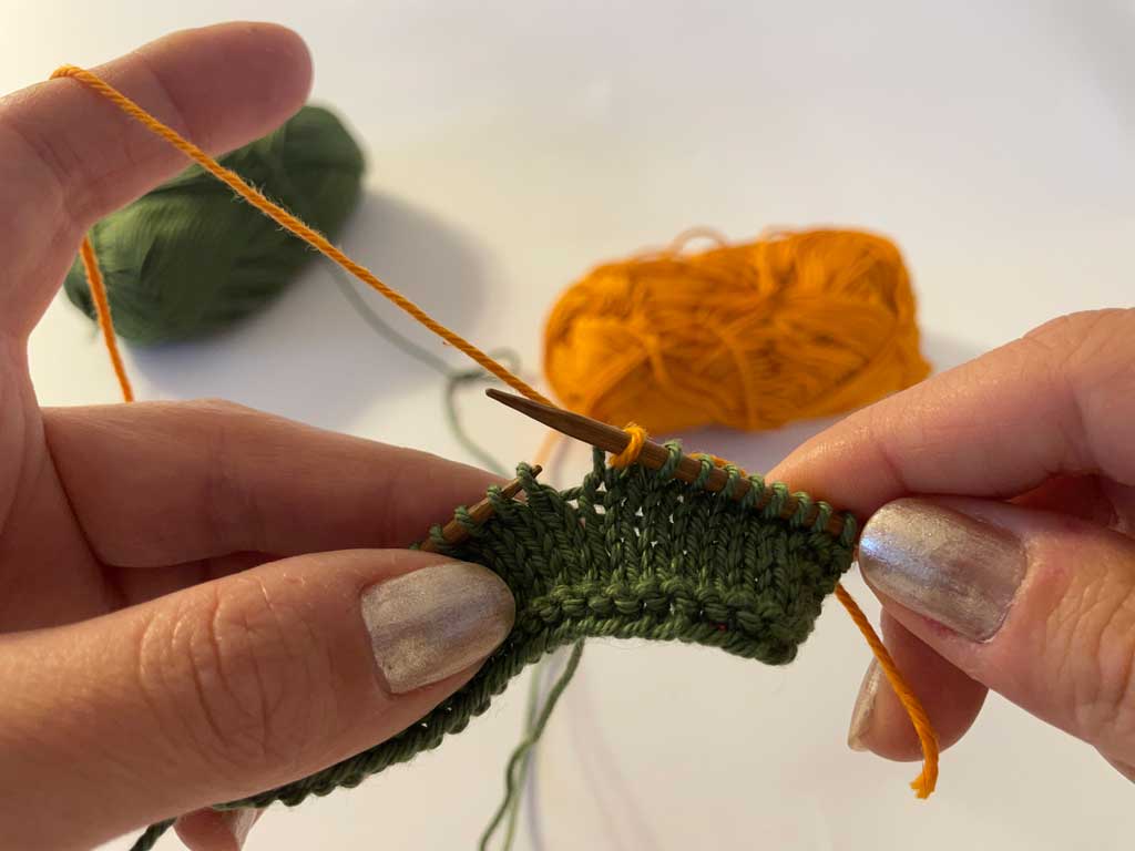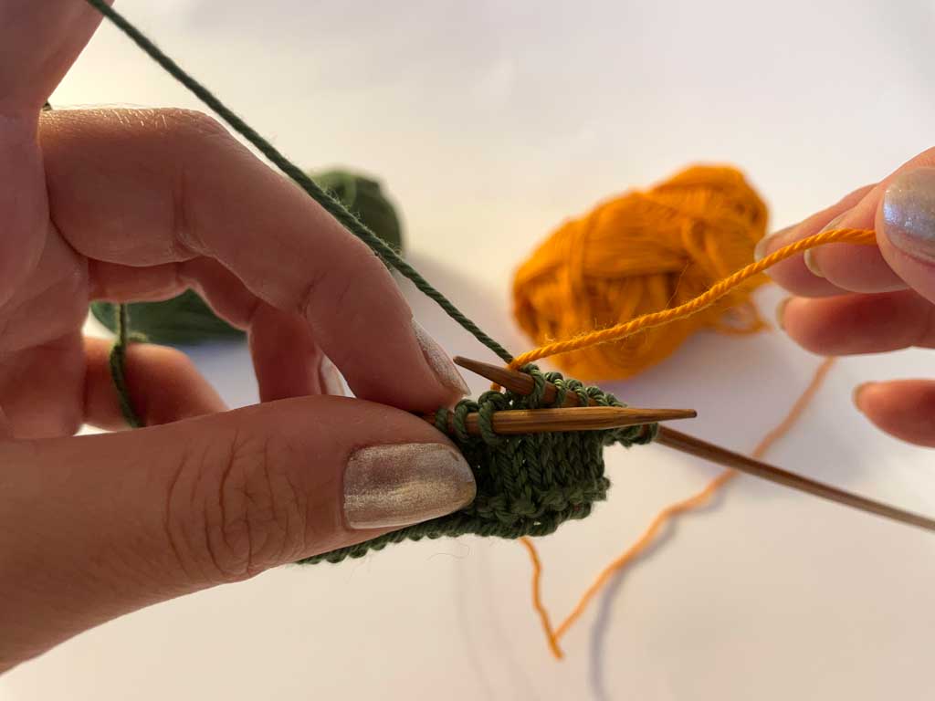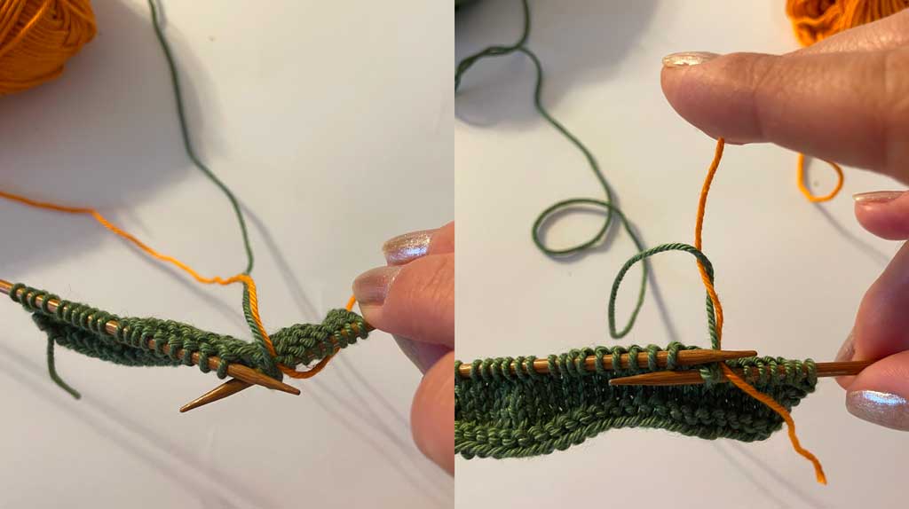 04: Ispletite sledeću petlju u novoj boji. Možete staro predivo pridržavati prstima uz desnu iglu da ga slučajno ne biste pokupili dok započinjete pletenje novom bojom.