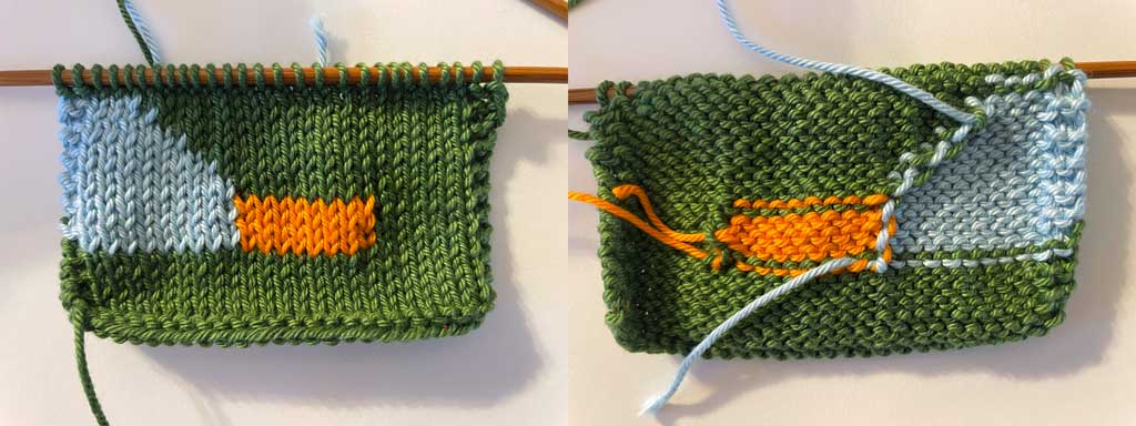 Na ovaj način dodajemo novu boju na pravu (klot) stranu rada. Na naličju (frket strana) će ostati krajevi prediva koje smo dodavali, a ti krajevi se na kraju uvlače u pletivo kako ne bi bili vidljivi.