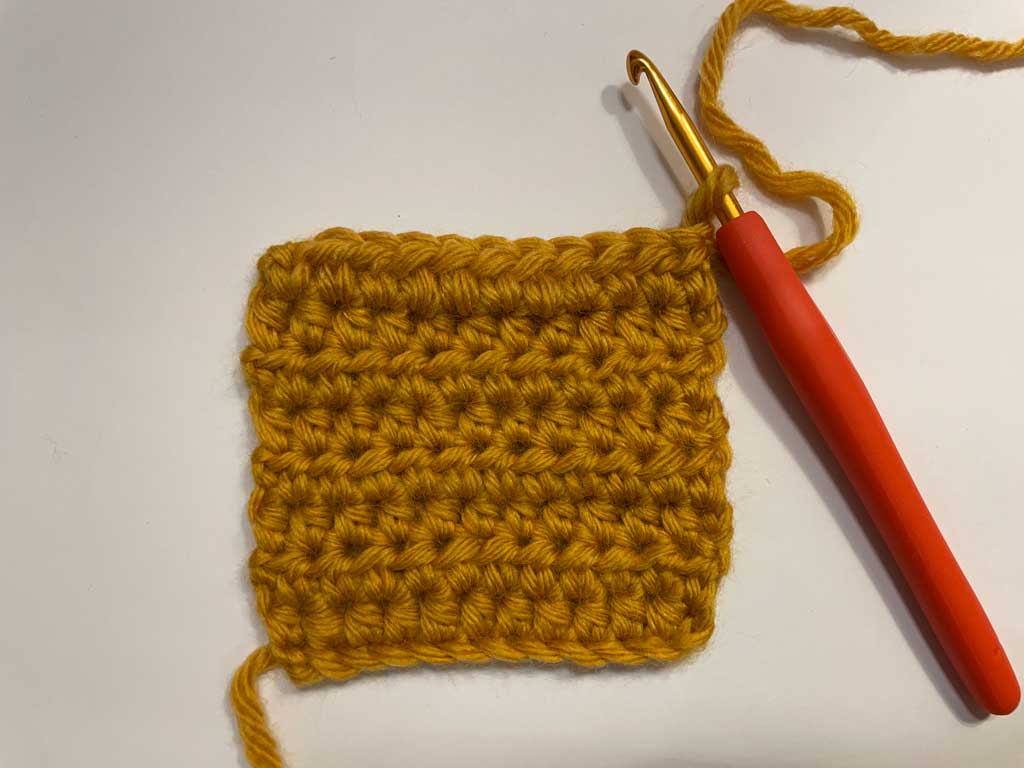 02: Ispletite još jednu petlju starom bojom. Na ovaj način ćete zarobiti kraj prediva nove boje na naličju.