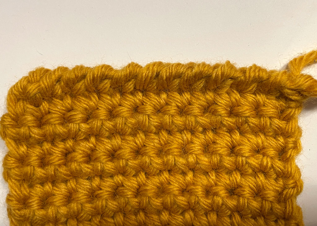 Heklanje niskog stubića kroz zadnju nit stvara izražene horizontalne linije i elastičniju strukturu rada. Ova varijacija je odlična kada želite reljefan efekat ili izgled sličan pletenju.