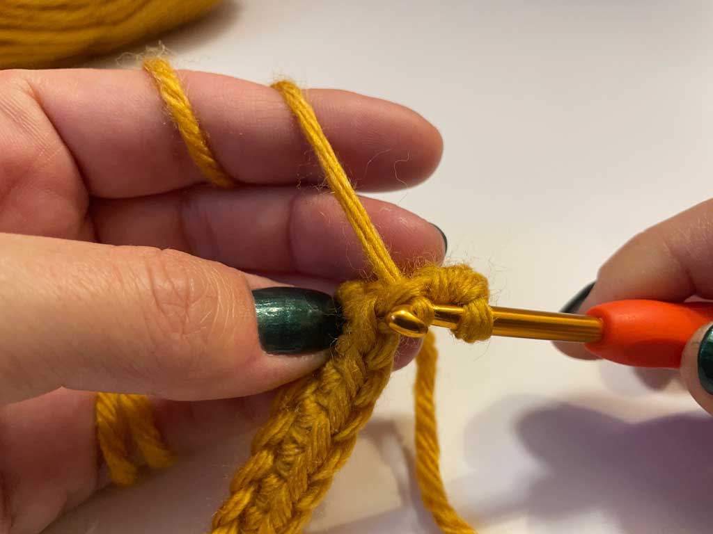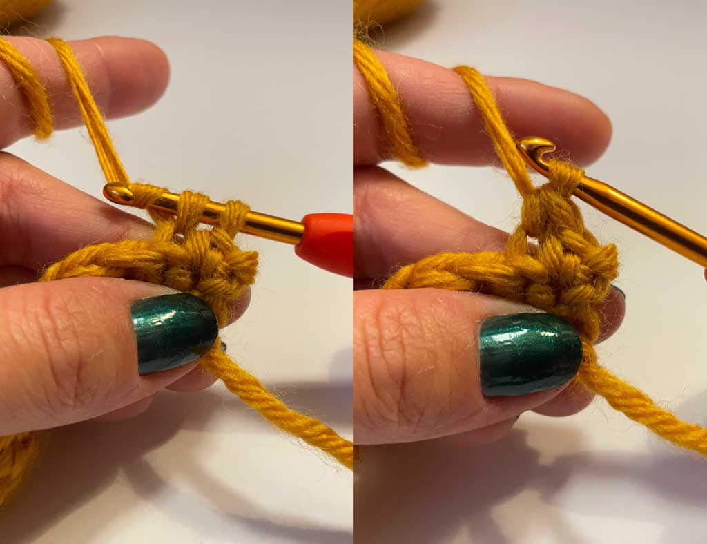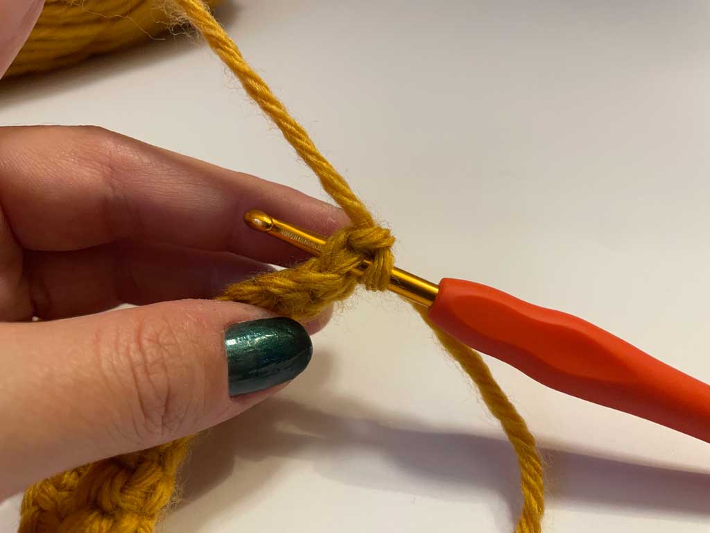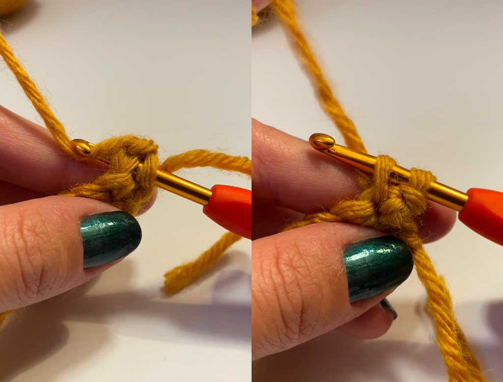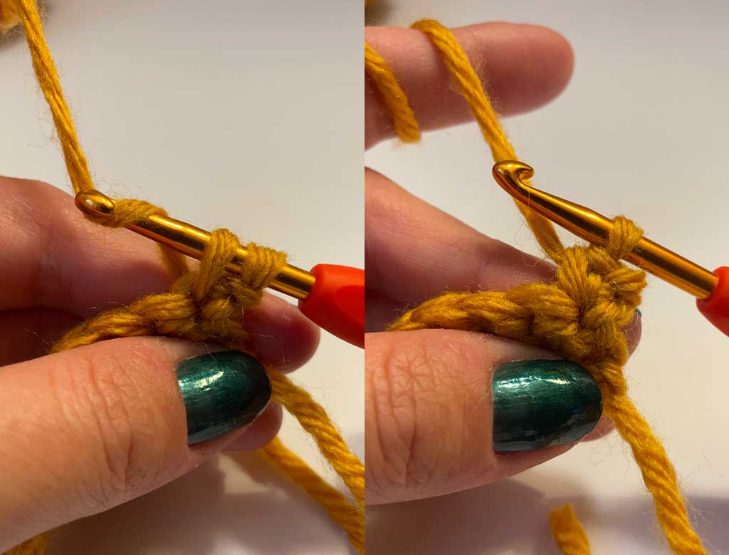 03: Ponovo zahvatite predivo heklicom i provucite ga kroz obe petlje na heklici.